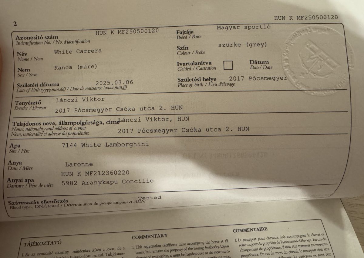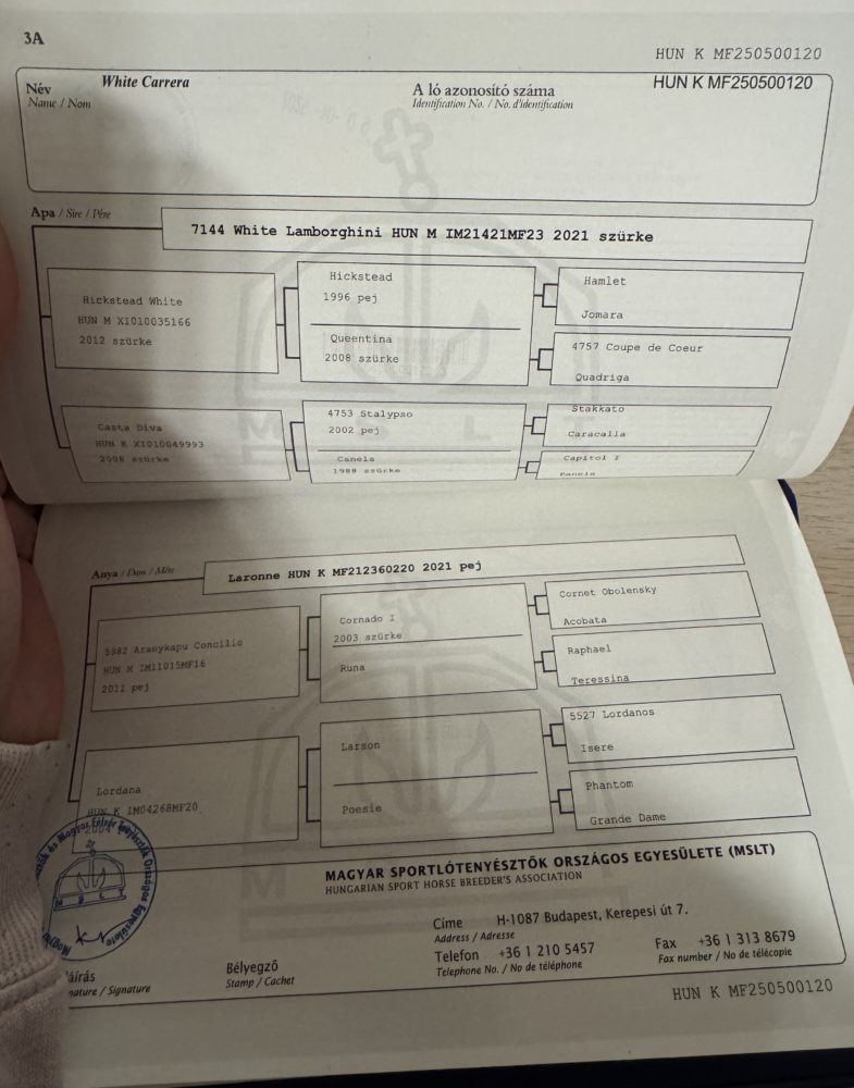 Szerető gazdát keres egy saját tenyésztésű, 2025. március 6-án született szürke kanca csikó. Nagy és erős csontozatú, ugyanakkor finom felépítésű, elegáns megjelenésű, kiegyensúlyozott idegrendszerrel rendelkező, egészséges fiatal ló. Származása igazán ígéretes: Apja White Lamborghini, egy fiatal Hickstead White apaságú fedezőmén, anyai nagyapja pedig Concilio, aki Cornado I vonalát képviseli. A pedigrében olyan kiváló nevek is megtalálhatók mint az anyai ágon Lordanos, az apai ágon pedig Stalypso. A csikó a 2025-ös Kanca Csikóchampionátuson 5. helyezést ért el! Küllemét, származását és teljesítményét tekintve remek alap lehet sportkarrierhez vagy tenyésztési célokra egyaránt. A ló jelenleg Debrecenben található, megtekintése előzetes egyeztetés után lehetséges. Érdeklődni privát üzenetben vagy a megadott telefonszámon lehet. 06 30 473 7084 A ló irányára: 6500€ |