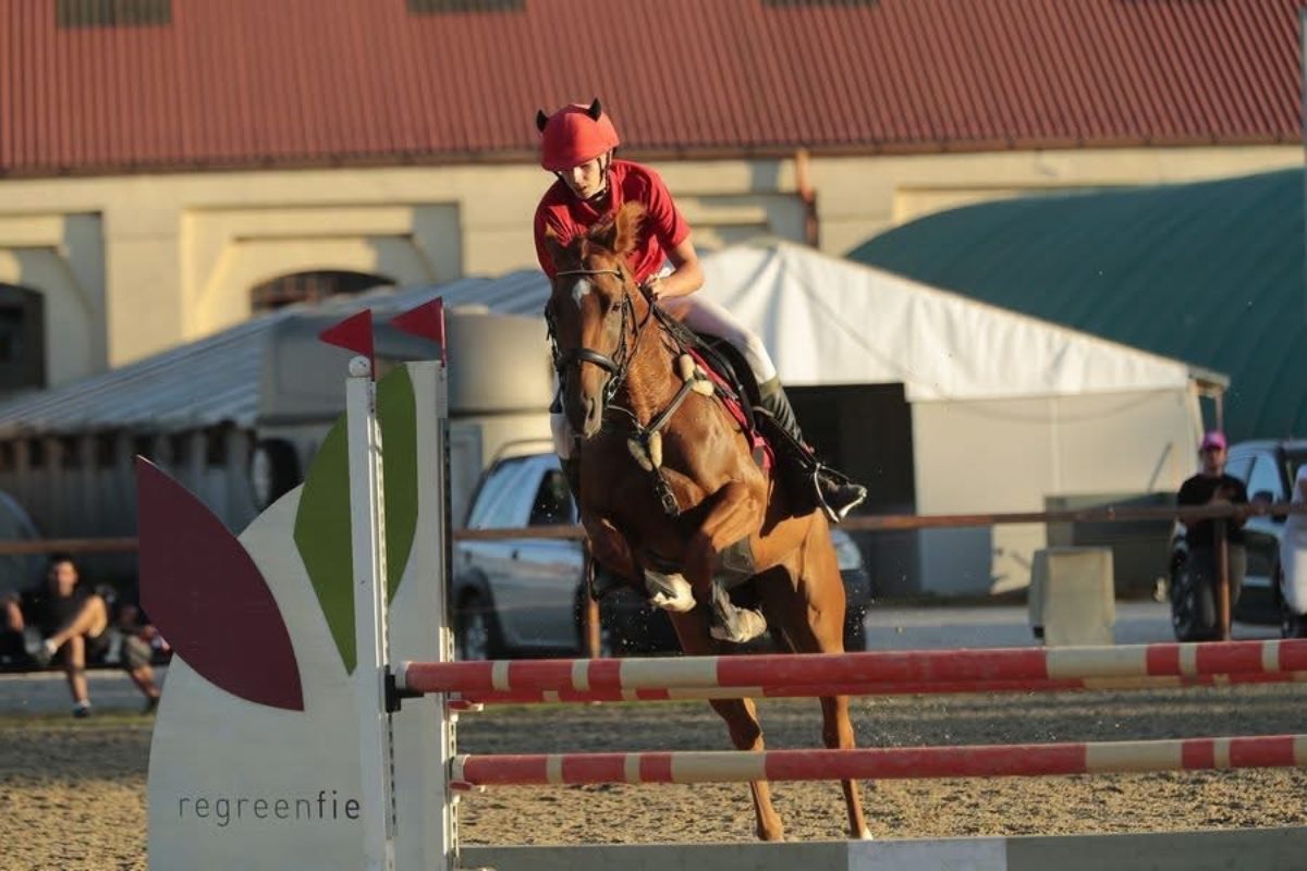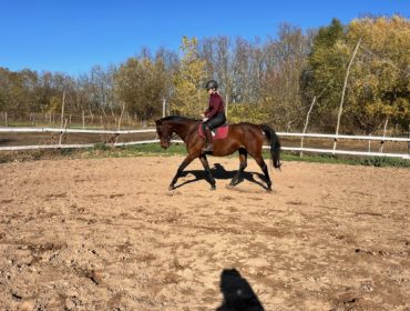 | Regina 5 éves, sárga angol telivér kanca,kb 160 cm magas. Földről nagyon kedves,bújós ló. Átlovagolt, lovaglásban haladó lovasnak ajánlott. Nem fél semmitől,nem bakol,nem ágaskodik de van benne sebesség. Jó ugróképessége van,szabadon 110cm-ig próbáltuk. Szabadidős ugróverseny rendszeres résztvevője,90 cm-ig ment és minden versenyen dobogós helyen végzett. Mindent megugrik,nem kerül,nem megy mellé. Teljesen egészséges,minden papírja oltása,vérvétele rendben van. |