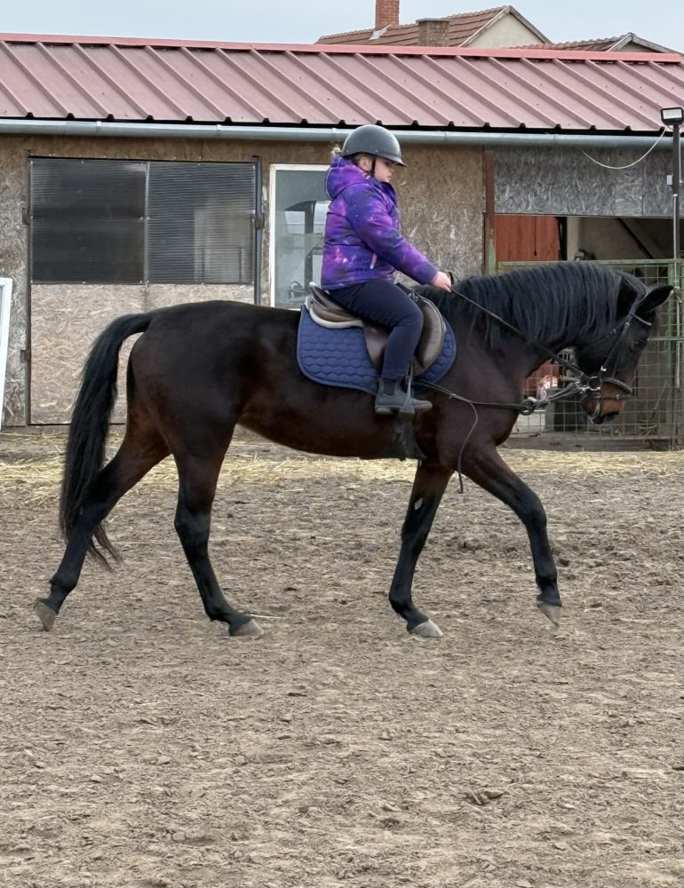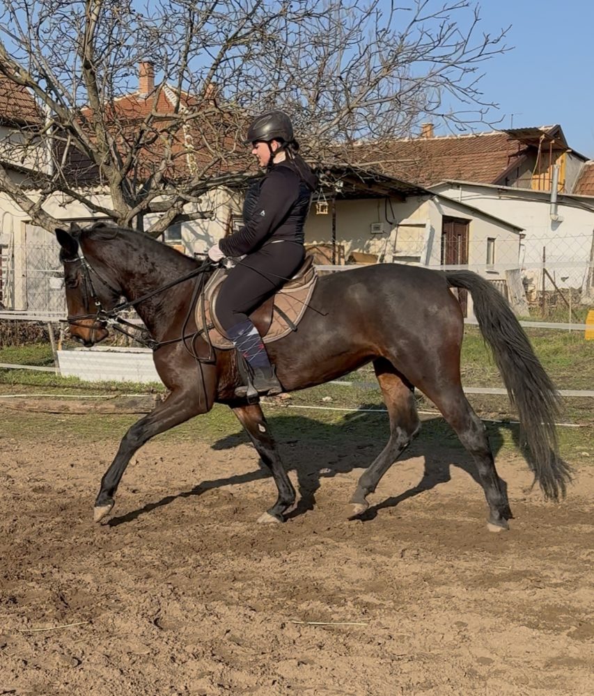 | Nyugodt, kedves természetű, könnyen kezelhető: köthető, vezethető, lószállítóra gond nélkül felmegy, futószárazható. Jelenleg versenyre készítjük, képzése folyamatos, gyorsan és szívesen tanul. Gyerekek is foglalkoznak vele, valamint lovagolják gond nélkül 7 éves kortól. Ügyességi és ugró versenyeken vett már részt kezdő lovasokkal, valamint terepen is megbízható. Díjlovaglásra, díjugratásra és ügyességi versenyekre is alkalmas lehet. Lóútlevéllel rendelkezik! Szuper választás kezdőknek és sportcélra is! |